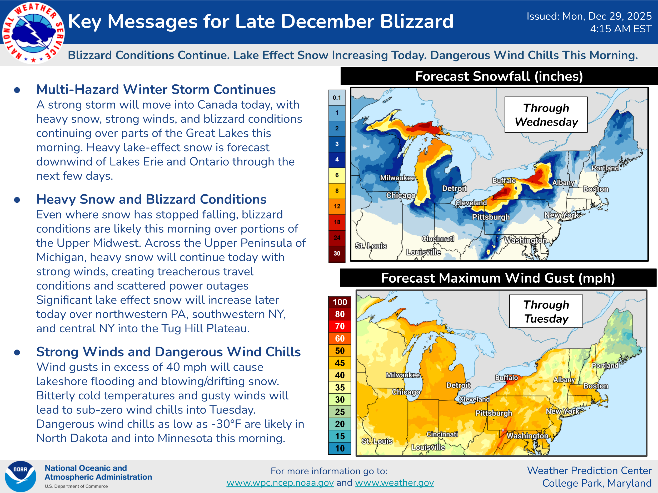 For today into Tuesday, the intense low pressure system will continue to produce strong winds in the Great Lakes and Northeast region and heavy lake effect snow downwind of the lakes. As noted in the NWS Weather Prediction Center key messages above, even where snow has stopped falling, strong winds in areas with recent snowfall will cause dangerous travel with blowing and drifting snow.