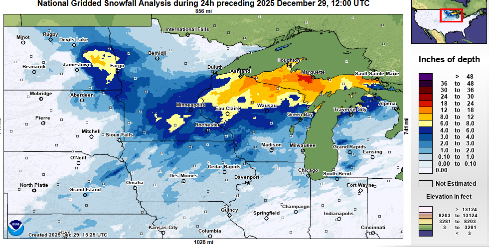 Sunday was an active weather day around the Great Lakes and Upper Midwest. The intense storm system we have been discussing the last couple of days brought heavy snow and strong winds with blizzard conditions in many locations. The heaviest snow (24 hour snowfall analysis from NOAA’s National Operational Hydrologic Remote Sensing Center (NOHRSC) above) fell over the Upper Peninsula of Michigan as moisture from Lake Superior enhanced the snowfall.