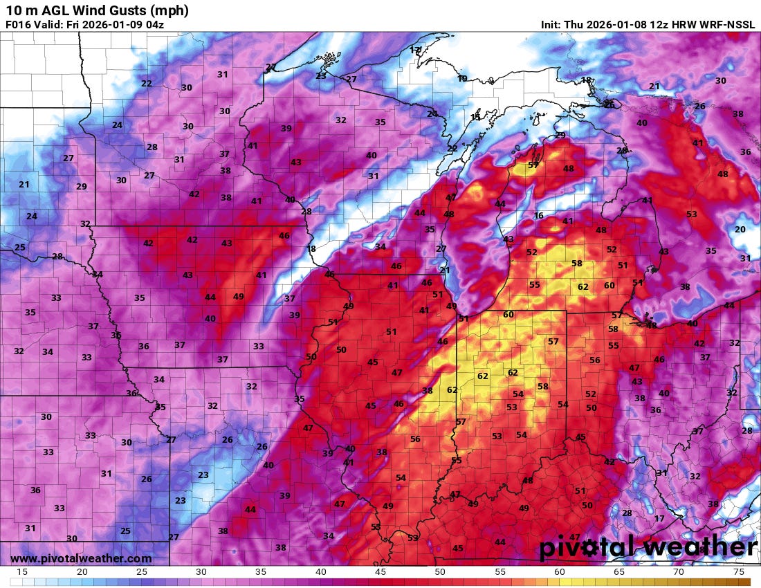 Some of the high resolution models (NSSL WRF above) show showers and thunderstorms continuing to produce strong wind gusts as the activity moves into the lower Great Lakes tonight while the storm system continues to intensify. While this is a lower probability outcome right now, this is the type of setup where if a more organized band of showers and storms persists widespread damaging winds could occur, so it will be worth watching the evolution of things into tonight.