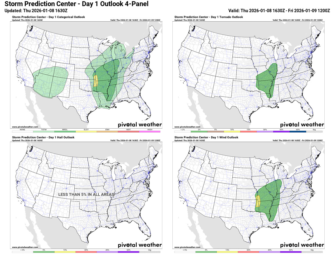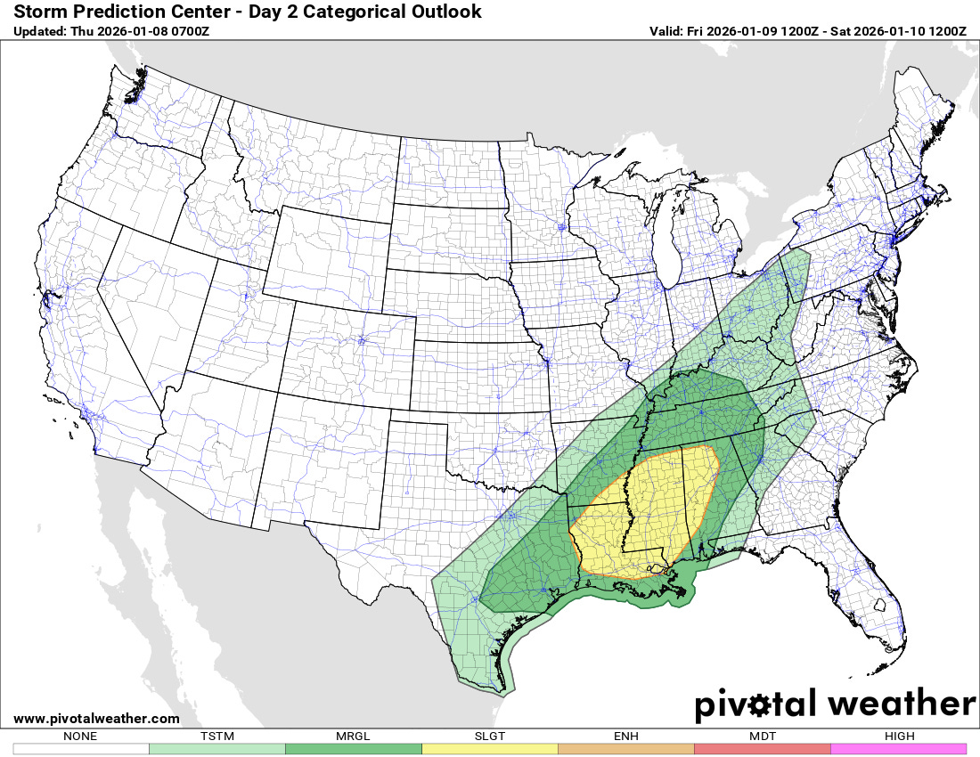 The threat of severe weather will continue on Friday across the lower Mississippi Valley, although this risk seems to have diminished somewhat compared to earlier forecasts — as the atmosphere has trended stronger with today’s low pressure system and associated severe weather risk, tomorrow’s has decreased somewhat. Still, a few severe thunderstorms with damaging winds and tornadoes appear possible with the Storm Prediction Center having a slight (level 2 of 5) risk (shown above).