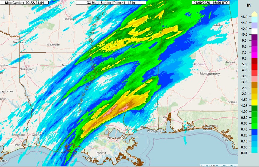 This moisture has already been feeding showers and thunderstorms with heavy rainfall in the Lower Mississippi and Tennessee Valley regions, particularly over parts of southern Mississippi and eastern Louisiana where a band of 2-4” has fallen over the last 12 hours.