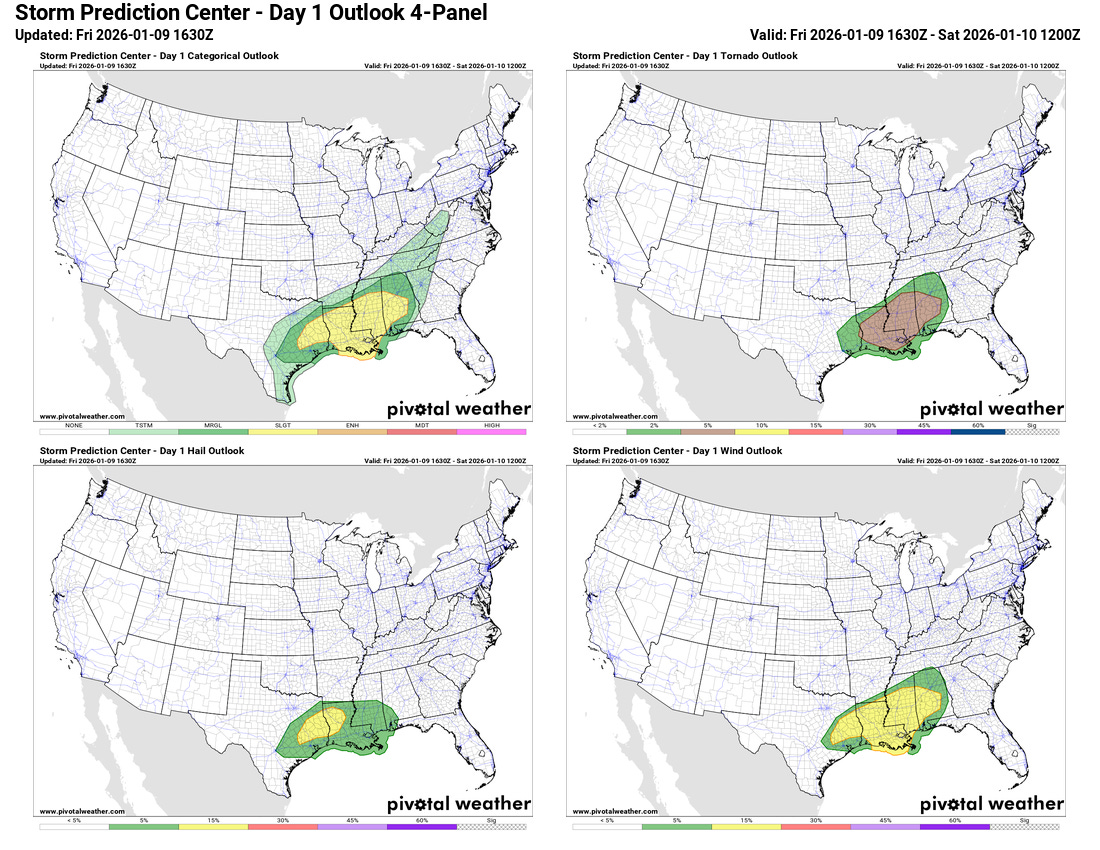 There will also be a risk of severe thunderstorms across this region this afternoon and tonight. Early morning severe storms already produced a few tornadoes in parts of central and southern Mississippi, and as the next upper level weather disturbance approaches from the west, the risk of severe storms should increase across far eastern Texas and northern Louisiana later this afternoon. The threat should then shift across Mississippi and into western Alabama tonight. Damaging winds and a few tornadoes look to be the biggest risks with these storms, although some hail is also possible especially across eastern Texas and western Louisiana.
