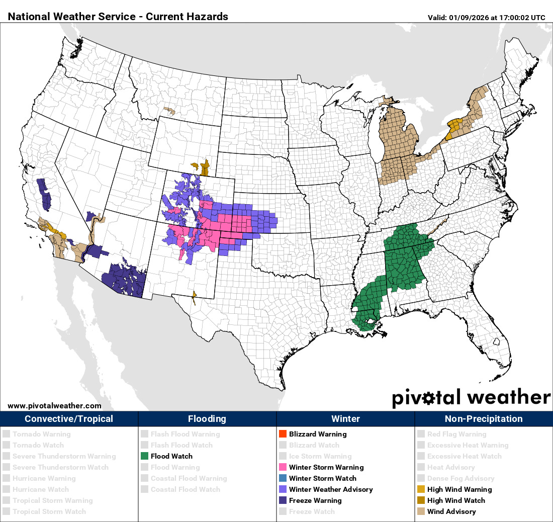 On the cold side of this storm system, moderate to heavy snow is expected over the next 24 hours across parts of the Rockies and Plains, and winter storm warnings and advisories are in effect. Colder air filtering in behind the system has resulted in the issuance of freeze warnings for parts of California and Arizona. As of now, though, no record cold temperatures are forecast.