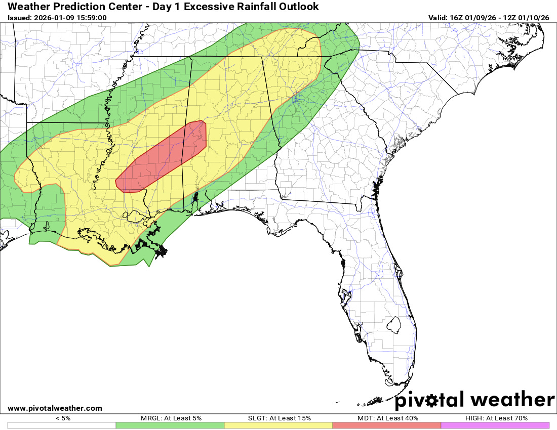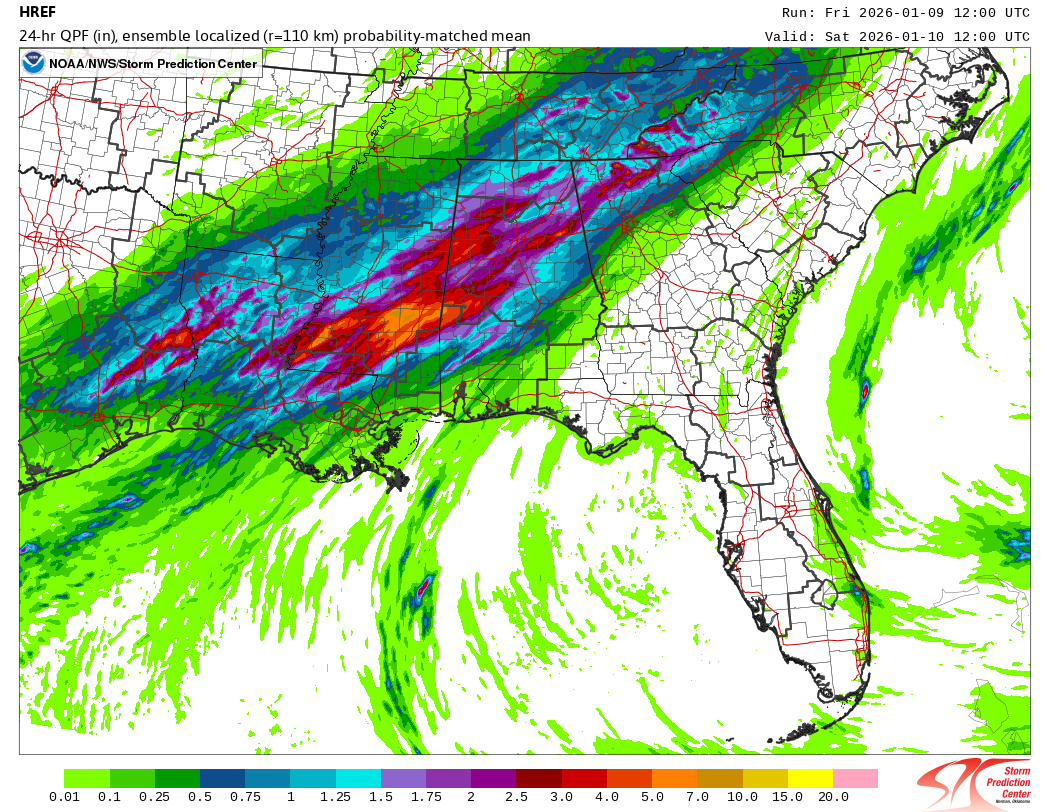 Additional disturbances moving along a slow moving cold front will trigger additional waves of showers and thunderstorms with heavy rainfall across this region through tonight, with the morning high resolution ensemble models suggesting areas of 4-7” of rain possible across southern Mississippi and western Alabama on top of rain that has already occurred.