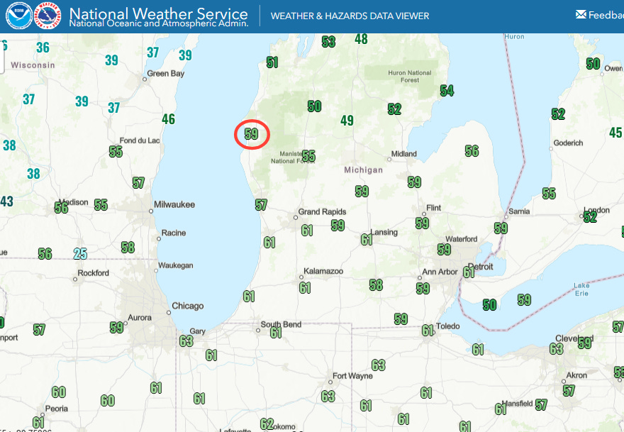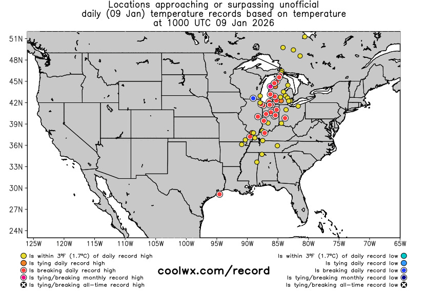 Numerous locations in the Great Lakes region set daily record high temperatures during the early morning hours today. The NWS automated observation site at Ludington, MI (circled) recorded a preliminary high temperature of 59F at 3:15 am CT. If this max temperature is confirmed at the nearby NWS co-operative climatic site, it would be an all-time monthly record high temperature for January, surpassing a record of 58F set on January 27, 1916. Regardless of if the official monthly record is set, it is truly amazing to see temperatures near all-time monthly record highs in the pre-dawn hours.