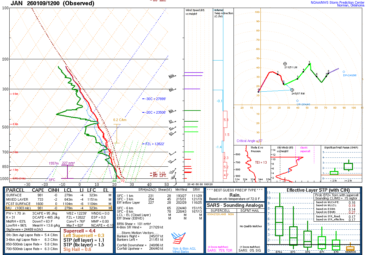 Obviously, increased levels of moisture can produced increased rainfall rates. This morning’s upper air balloon data from Jackson, MS (above) showed a precipitable water (PW, (the depth of water that would result from all of the moisture in the atmosphere being condensed as rain) value of 1.70.” Looking at the upper air climate record from the Storm Prediction Center, this appears to be a daily record at the site and is certainly near the top of PW values ever observed in January here.
