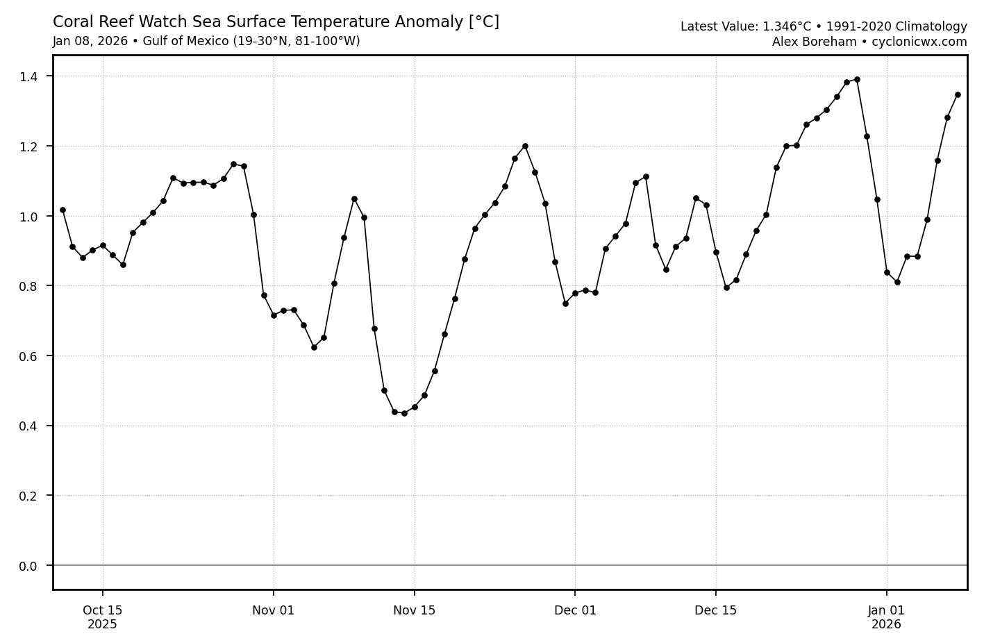 That Gulf moisture is being amped up by unusually warm Gulf of Mexico sea surface temperatures (SSTs) that have been running near record warm levels for this time of year — the warmer the SSTs and atmosphere, the higher the moisture content of the atmosphere. So as global warming continues, two very clear impacts on our climate are higher levels of atmospheric moisture and warmer overnight low temperatures.