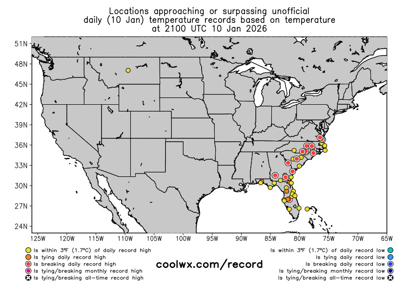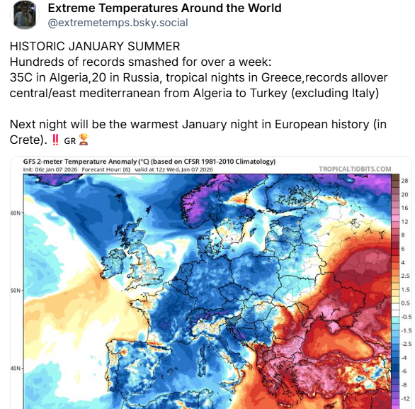 Globally, record warmth has been prevalent as well — along with the heat I have been discussing in Australia, areas of eastern Europe, northern Africa, and central Asia have seen all-time January warmth over the last several days. This has included extremely warm minimum temperatures above 20C in locations like Greece as discussed in the post by Extreme Temperatures Around the World above.
