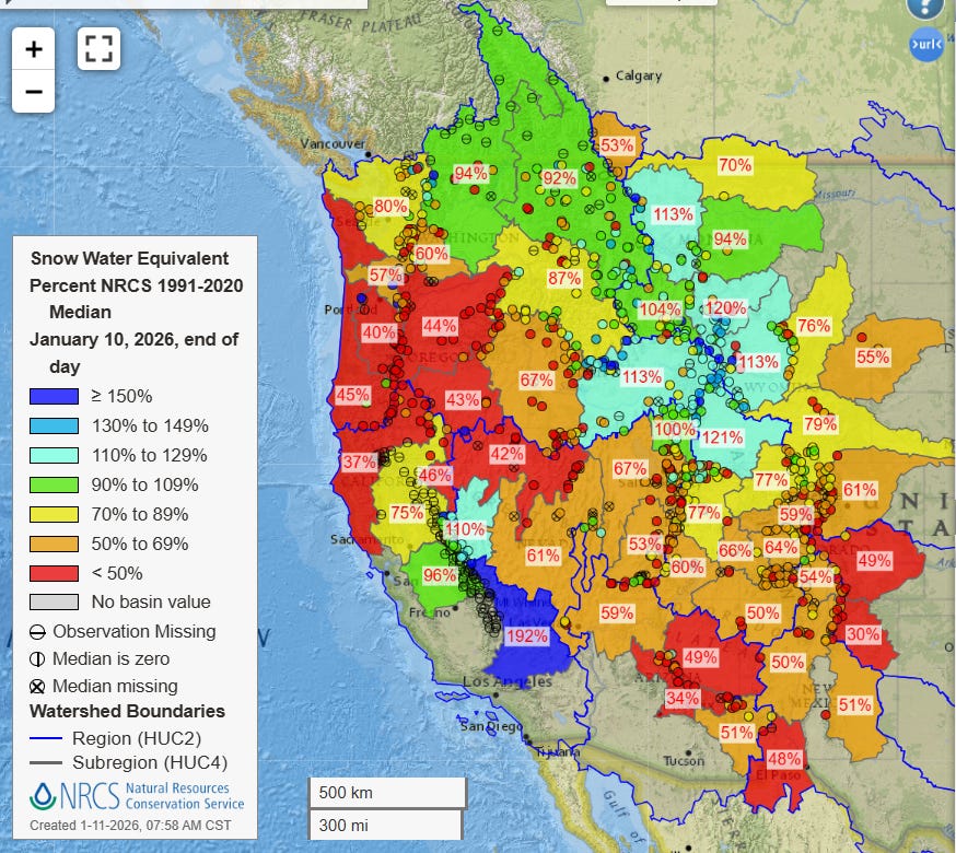 The snowpack is even more of a mixed bag farther west closer to the coast. The central and southern Sierra is well above normal as the atmospheric river storms of late December eventually had sufficient cold air to lower snow levels and result in very heavy snowfall. Farther north, though, somewhat less precipitation combined with warmer conditions when precipitation fell has led to much below normal snowpack for much of northern California and Oregon, as well as into the Great Basin.
