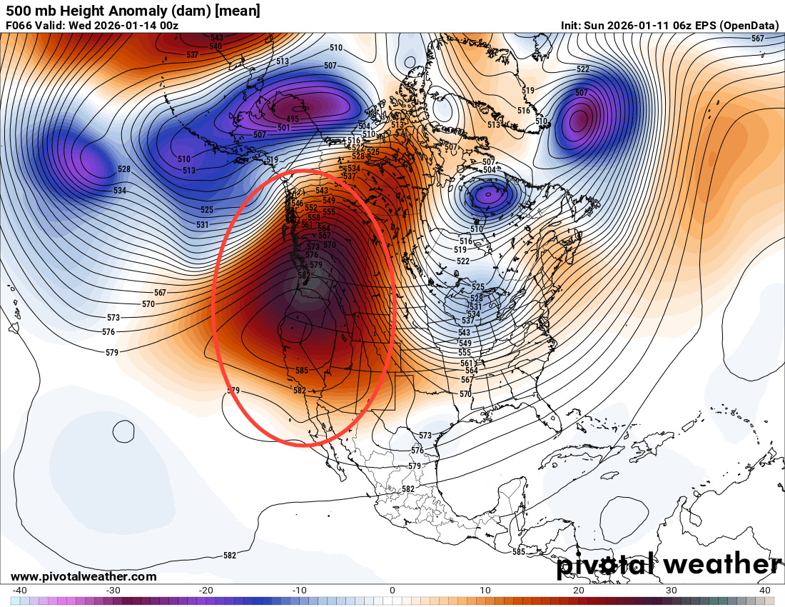 An unusually intense middle and upper level area of high pressure still looks on track to develop along the West Coast and eastern Pacific over the next few days, and this will likely be the dominant weather feature for North America for the next 10 to 14 days. This means above normal temperatures for much of the West (except for areas like the San Joaquin Valley where low clouds and fog will keep temperatures colder) as well as generally dry weather. This should mean the snowpack will be eroding over the next couple of weeks for much of this region.