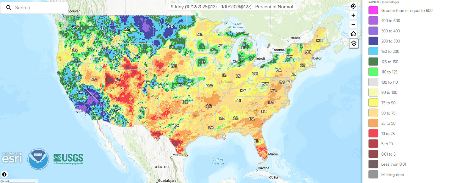 Taking an updated look at how the nation is faring as far as precipitation, the NWS percentage of normal precipitation over the last 90 days (through yesterday morning, above) shows that most of the country has been abnormally dry. Parts of the central and southern Intermountain West, the Southern Plains and Texas, and Florida have been especially dry.