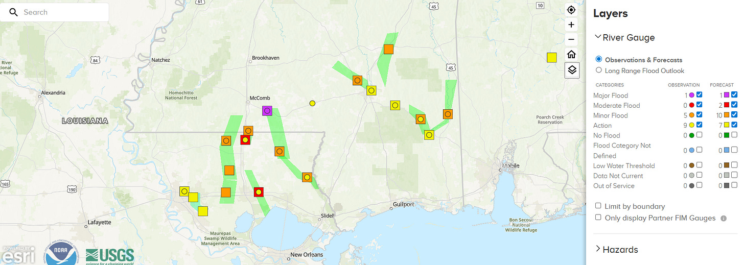 Starting off this morning with a quick addendum to yesterday’s post about the very heavy rainfall in parts of southern Mississippi and eastern Louisiana. While as expected the river flooding did not end up being a huge impact in spite of the rather widespread 5-10” of rain across the region due to the prolonged dry weather leading into the event, the Tangipahoa River is now forecast to go into moderate flood and the Bogue Chitto River has reached major flood stage at Tylertown, MS. Given the dry weather and low river levels going into this rainfall event, this is quite impressive and further emphasizes the magnitude of this rainfall event.