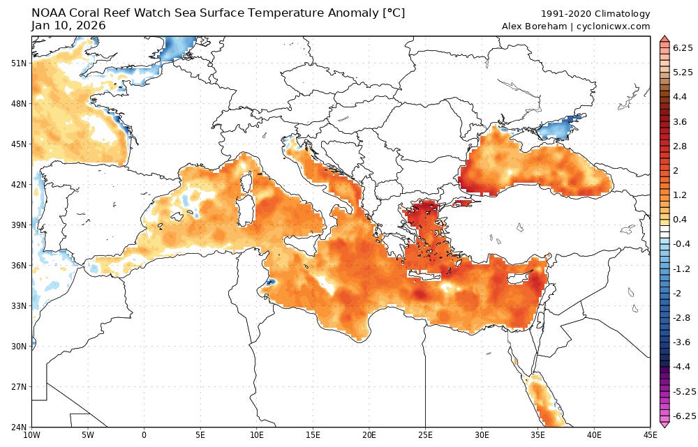 Like the Gulf of Mexico, the Mediterranean Sea is also seeing well above normal sea surface temperatures, which contributes more moisture to the atmosphere and leads to warmer morning low temperatures.