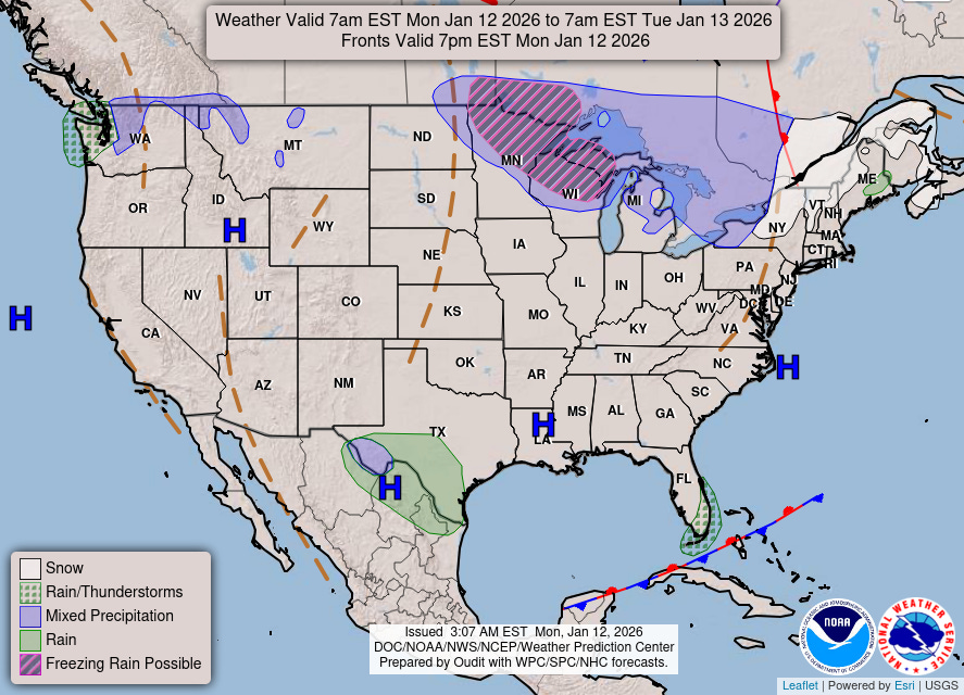 Turning to weather, things are actually very quiet across the lower 48 for a change today as shown by today’s weather map from the NWS Weather Prediction Center above.