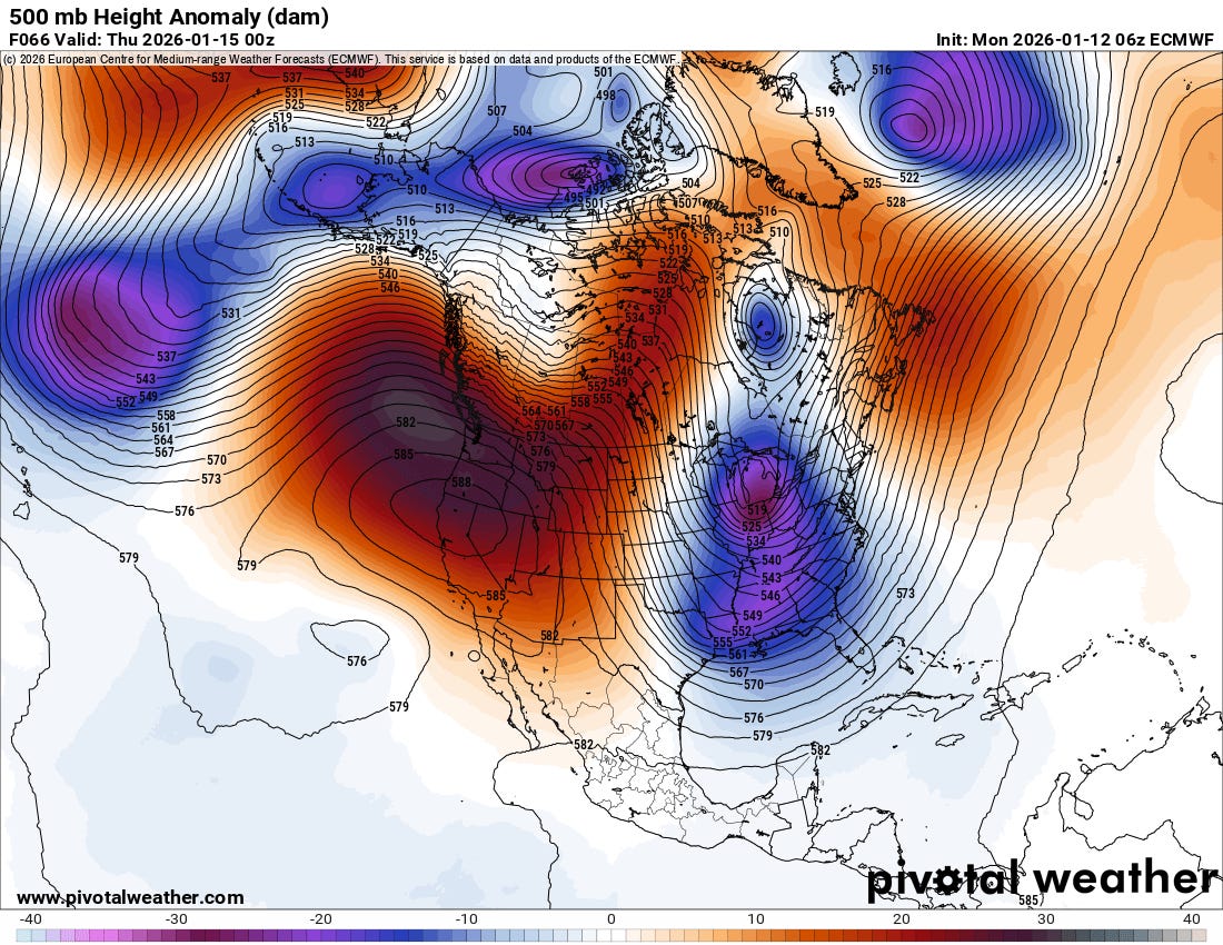 The main focus for this week continues to be on the developing pattern of an unusually large and strong mid and upper level area of high pressure across the eastern Pacific and western US, with a corresponding downstream upper level trough of low pressure across the eastern US. For the West, this should bring mainly dry and warm weather including some record highs. However, as in a very similar pattern in early December, locations like the San Joaquin Valley that are prone to low clouds and fog in stagnant weather patterns will likely see those conditions setup resulting in cooler than normal weather.
