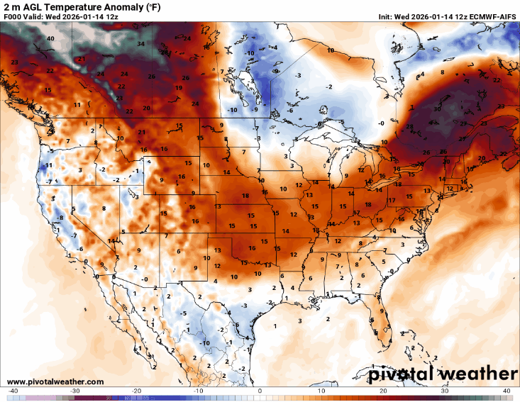 This loop of surface temperature anomalies over the next 6 days from this morning’s European AI model shows how this initial surge of cold air will move off the Southeast coast early this weekend, followed by another even colder surge of air through the Midwest, Great Lakes and East. Meanwhile, out West above normal temperatures will dominate under the unusual large upper level high pressure area we have been talking — although you can also see the signals of cooler air in the valleys where trapped cold air and/or low clouds/fog will help keep temperatures from warming as much.