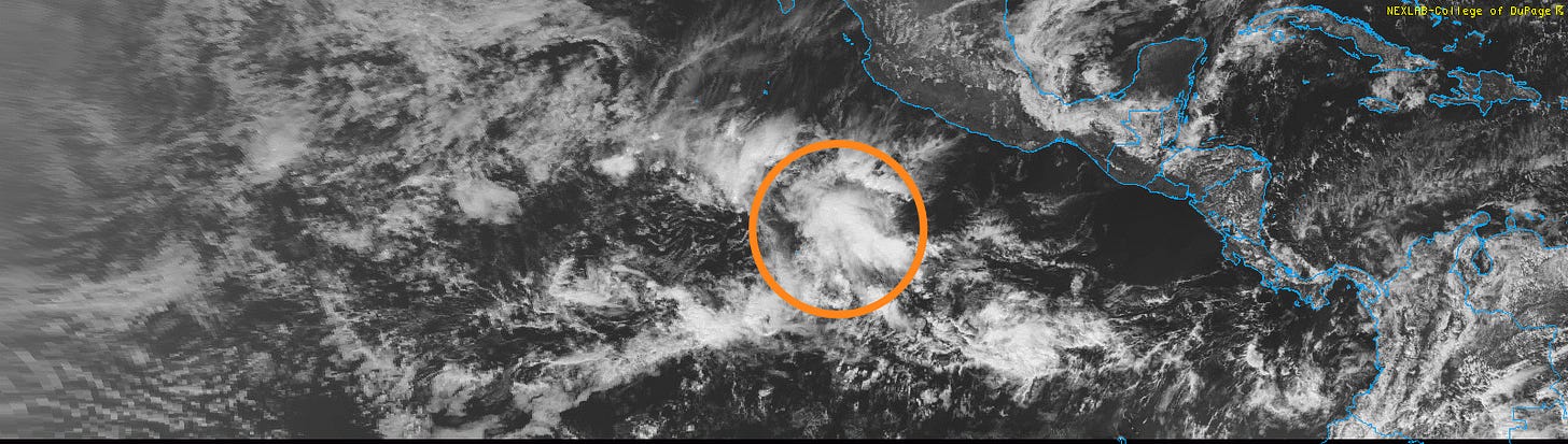 Finishing up today with an unusual (actually, unheard of) thing to be talking about in mid-January. A weak tropical disturbance (highlighted on visible satellite image above) appears to have formed in the eastern Pacific to the southwest of the west coast of Mexico. The US global model has been showing this system developing for a few days, but as I have discussed in many posts during Atlantic tropical season, the GFS has a very high false alarm rate for tropical cyclone development. However, in the last couple of days additional models have begun to show at least some minimal development, including the European model. Even the Google DeepMind AI, which I would expect would struggle in a very climatologically unusual situation like this, has some signal for development with about 10% of its members showing an organized tropical system developing.