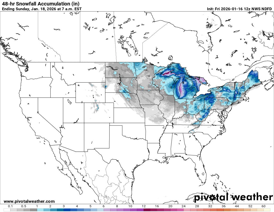 Heavy lake effect snow is expected the next 48 hours, along with light to moderate snowfall in higher elevations of the Northeast. The models continue to struggle with the track and strength of a low pressure system that should develop off the Southeast coast later this weekend. Some potential for at least light snow continues for Sunday for parts of the East Coast and we will continue to watch model and observational trends for any signs of a more significant system evolving.