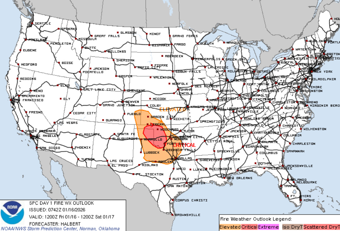 Strong northwest winds, dry air and ongoing drought will result in critical wildfire danger today across parts of the central and southern Plains.