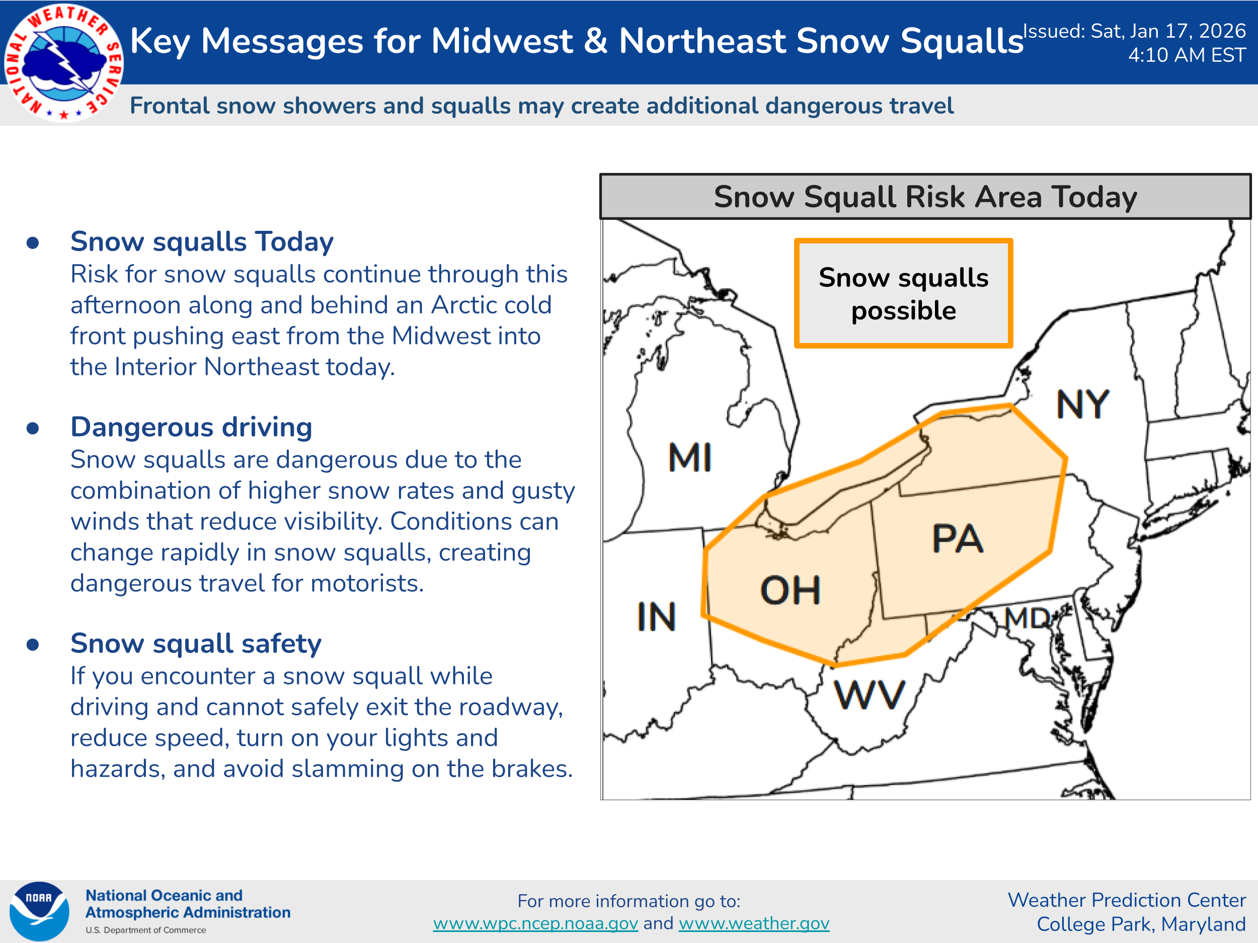Snow showers and squalls could cause dangerous driving conditions in parts of the Lower Great Lakes and central Appalachians today, so people planning travel in this area should be on the alert and monitoring for snow squall warnings from the NWS.