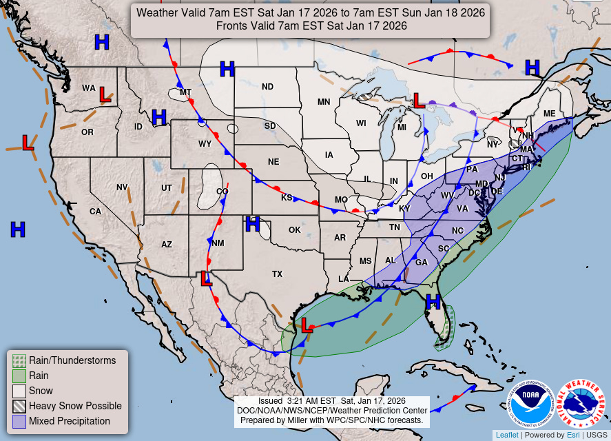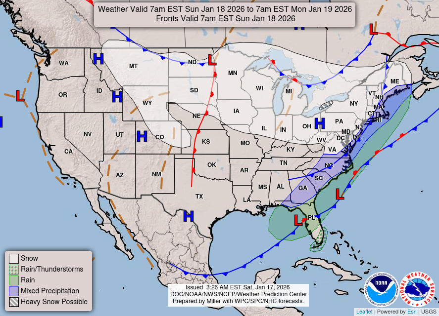 On Sunday, low pressure will develop off the Southeast coast, and with unseasonably cold air in place, mixed wintry precipitation will be possible from the Florida Panhandle across the Carolinas.
