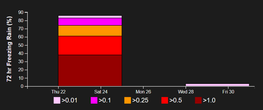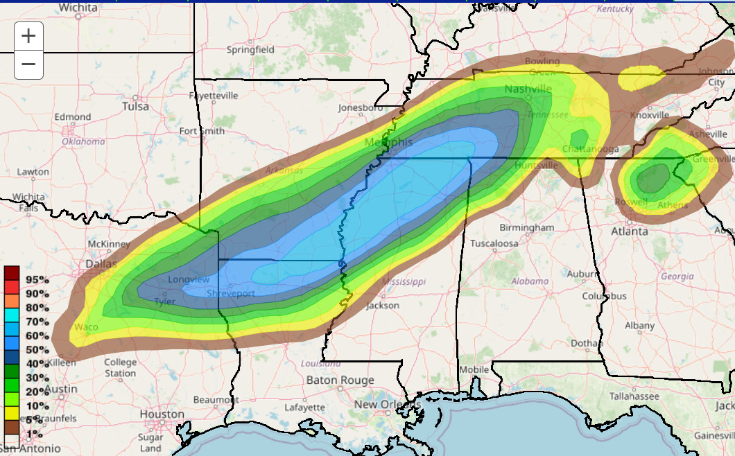 Some of this morning’s model forecasts show the potential for 1-2” of ice in some of these areas, and this probabilistic graphic from the NWS National Blend of Models for Oxford, MS shows about a 40% chance of more than 1” of ice accumulation. Widespread ice accumulations of greater than .5” would likely result in massive damage to power infrastructure and trees in the region which could mean prolonged power outages and serious impacts to travel.