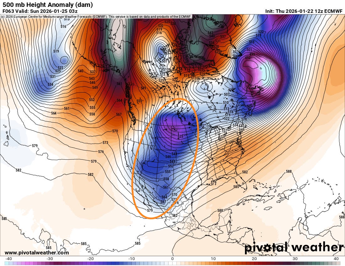 As we get closer to this major impactful winter storm, luckily the models seem to generally be starting to converge on the large scale weather pattern that will be driving it. Above is the 500 millibar (~18K ft AGL) forecast for Saturday evening from this morning’s European model — and it continues to show its trend toward a stronger, larger and more “phased” upper level low pressure system across the western and central US. The other models are generally trending in this direction now, and while there is still of course uncertainty in the forecast, there is enough confidence and we are getting close enough to the event where we can start to focus a bit more on specific potential amounts and impacts.
