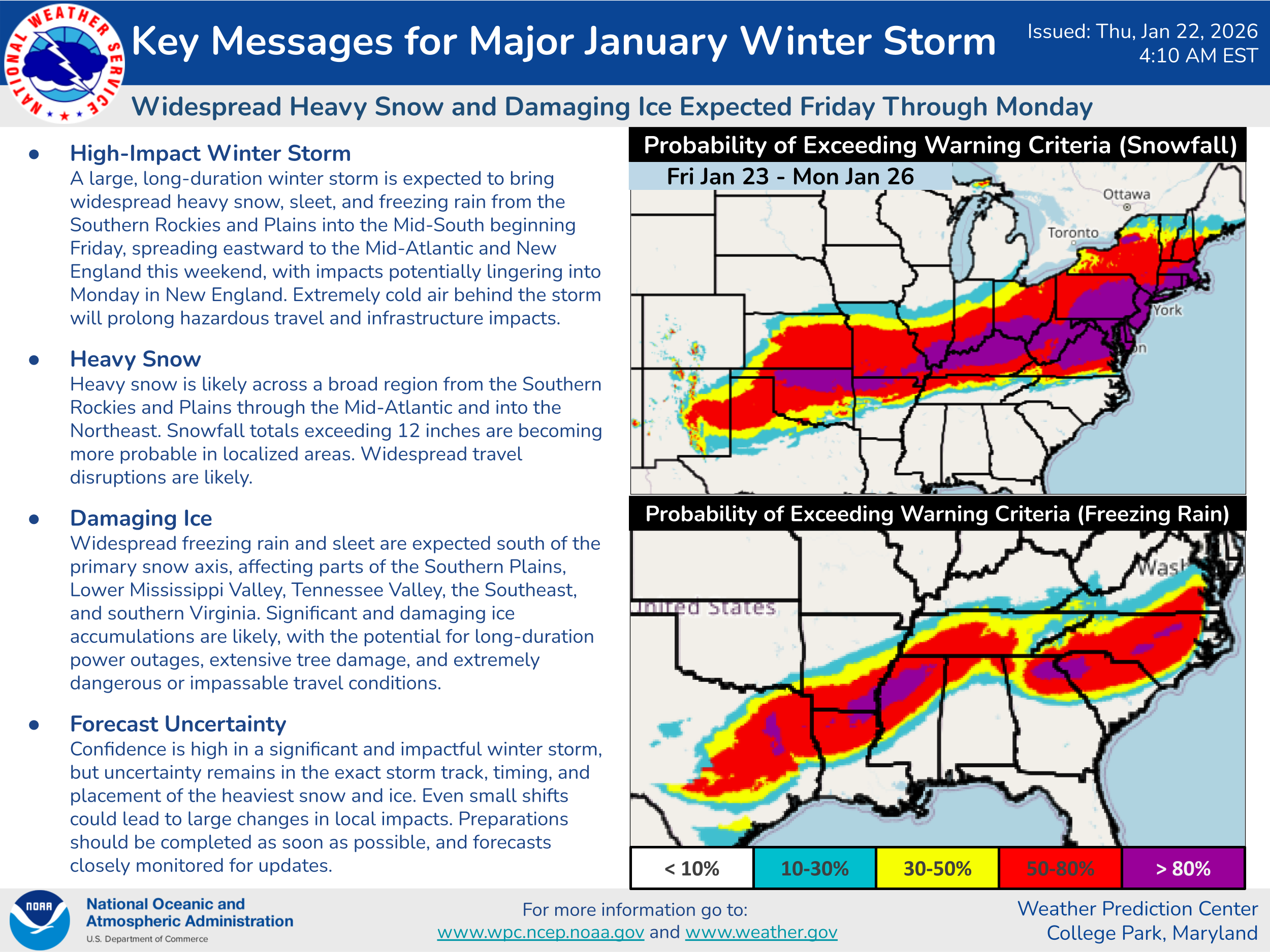 As shown in the NWS Weather Prediction Center key messages above, a broad swath of heavy snow is anticipated from the Southern Plains across the Mid-Mississippi Valley and into the Mid-Atlantic and Northeast, with localized accumulations of a foot or more expected. Farther south, a broad region of heavy — and in some spots, potentially very heavy and catastrophic — accumulations of ice are possible from central and northeast Texas across the Arklamiss Delta and into the Tennessee Valley, and also from northern Georgia across the Carolinas. In between these two areas, more mixed precipitation is anticipated including potentially heavy accumulations of sleet.