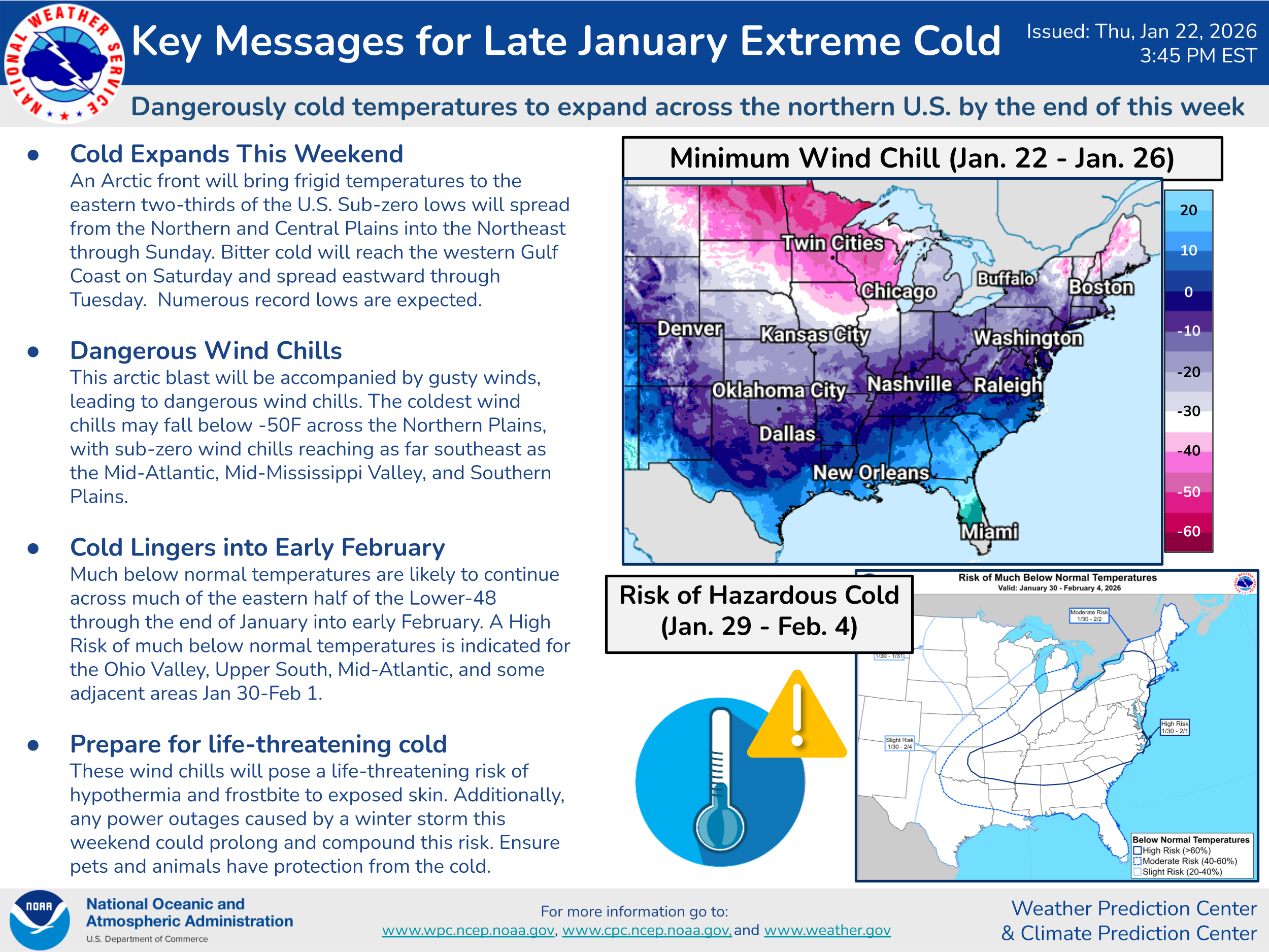Extreme cold warnings are in effect for large parts of the eastern two-thirds of the country, as cold air will push south to the western Gulf Coast. The weather pattern will continue to be favorable for repeated surges of Arctic air across the eastern United States for the next 7 to 10 days — which will be of particular concern if extensive power outages do occur in areas impacted by the anticipated ice storm.