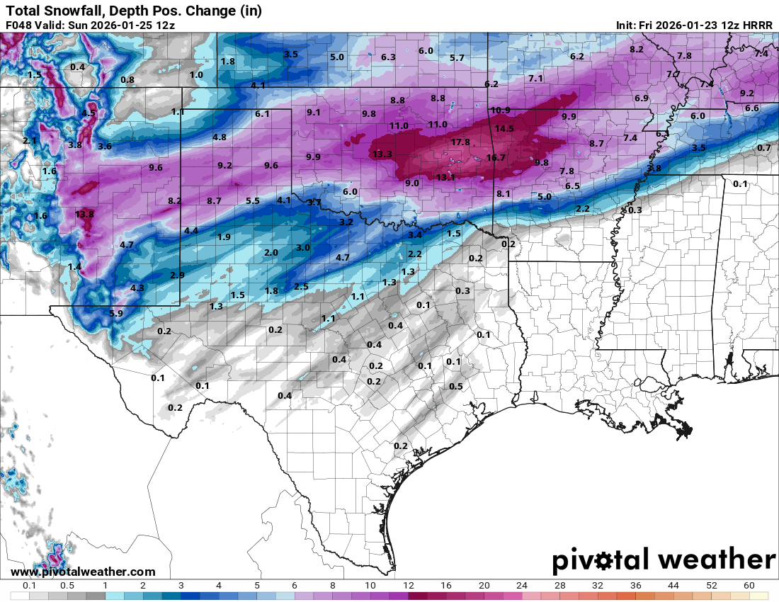 The initial focus for the winter storm will be in the south central states, where wintry precipitation will be developing today and multiple waves of moderate to heavy precipitation are expected through the weekend. There will likely be some localized bands and maxima of precipitation within this region due to small scale atmospheric features as well as actual thunderstorms. The high resolution models can give us some clues on to where these maxima might occur, and there has been a pretty persistent signal across multiple models and model runs (most recent High Resolution Rapid Refresh shown above) for an enhancement in snowfall somewhere along or north of I-40 in central/eastern Oklahoma and western Arkansas. One complicating factor for how much snow will fall in this region is the potential for sleet as well — which would bring down the snowfall accumulations but potentially further complicate travel with ice accumulations from heavy sleet. Bottom line, the forecast in this region is particularly complex and has higher uncertainty.