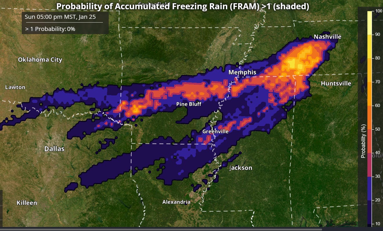 Looking at the potential ice accumulations farther south, amounts here will also be complicated by thunderstorms as well as how much sleet might occur. The REFS (rapid refresh ensemble forecast system) shows the highest probabilities for greater than 1” of ice accumulation from freezing rain across parts of southern Arkansas into northern Mississippi and middle Tennessee — where probability values actually show amounts greater than 1” likely. Obviously, ice accumulations at this magnitude would be particularly catastrophic, and meteorologists will be closely watching weather balloon data and near term model trends to try to better pin down precipitation type and intensity in this area.