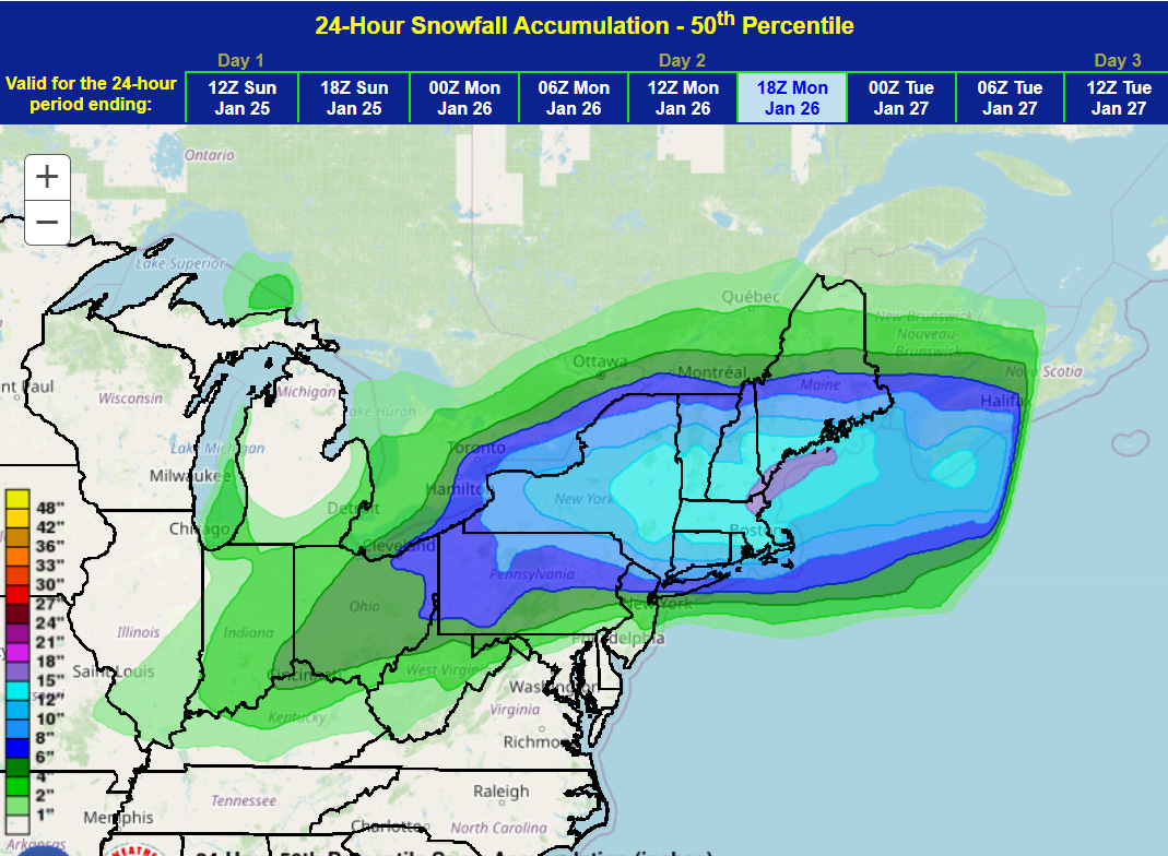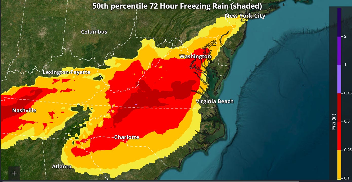 A reasonable worst case scenario (75th percentile probability) ice accumulation from the NWS National Blend of Models for the Mid-Atlantic suggests .5 to 1” ice accumulations are possible for much of Virginia, which could cause major damage to power infrastructure. Given the extremely cold temperatures expected after this event, this again would be of serious concern.