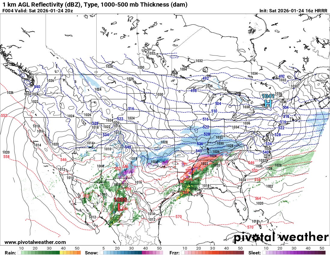 Good afternoon, apologies for the lateness of this post but there is a LOT to talk about. The advertised major winter storm is now in full swing across the central part of the country. This display of temperatures and radar shows extremely cold temperatures in the single digits have overspread much of the Midwest and Southern Plains, with 30F and colder temperatures as far south as northern Louisiana and the Mississippi Delta. Snow is falling across much of the Plains and Midwest, while mixed sleet and freezing rain is causing icy conditions across the Mid-South as well as parts of northern Texas.
