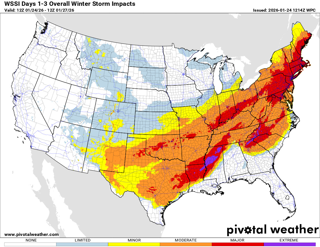 At a high level, the overall forecast with this system generally looks on track with widespread moderate to major impacts through Monday across a large swath of the country from Texas to the Northeast as shown by the NWS Weather Prediction Center (WPC) Winter Storm Severity Index (WSSI). However, there has been some noticeable evolution in the details for several areas, and I want to go through the next few days in detail to describe some of those important changes.