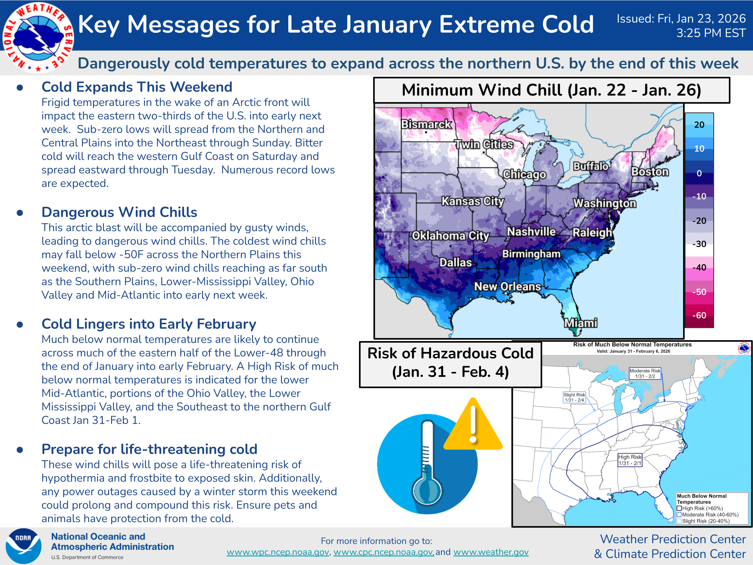 Of course, the extreme cold also continues to be a serious concern with waves of cold air continuing for the coming days — this WPC key messages graphic describes it well.
