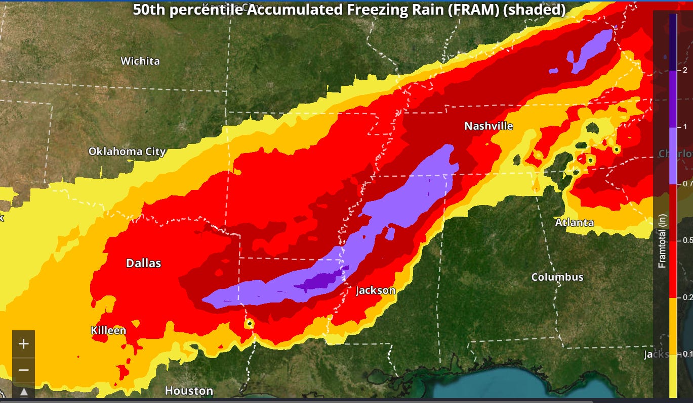 Widespread significant ice accumulation from freezing rain is thus expected from the Arklatex across the Arklamiss Delta and into parts of the Tennessee and Ohio Valleys. Particularly heavy ice accumulations of .5-1.5” look probable from parts of northeast Texas and northern Louisiana across northern Mississippi into parts of Tennessee and Kentucky. As we have been discussing, these sorts of glaze accumulations due to freezing rain would cause catastrophic damage to power infrastructure and trees along with resulting in nearly impossible travel. As I discussed in a note yesterday, the Atlanta metro area continues to be an area that is right on the edge. While currently in an ice storm warning, model trends continue to suggest a significant gradient in ice accumulation across the metro area, with the more impactful ice accumulations from the Athens area northeast where the “wedge” of cold air looks to be more pronounced.