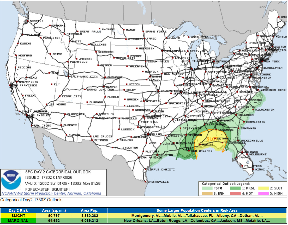 Last, but not least, the trend toward a stronger Gulf Coast low also means a greater risk for severe thunderstorms in the warm sector of the system. A slight (level 2 of 5) risk of severe storms is now in place for Sunday along the eastern Gulf Coast region, with damaging winds and tornadoes the primary risks.