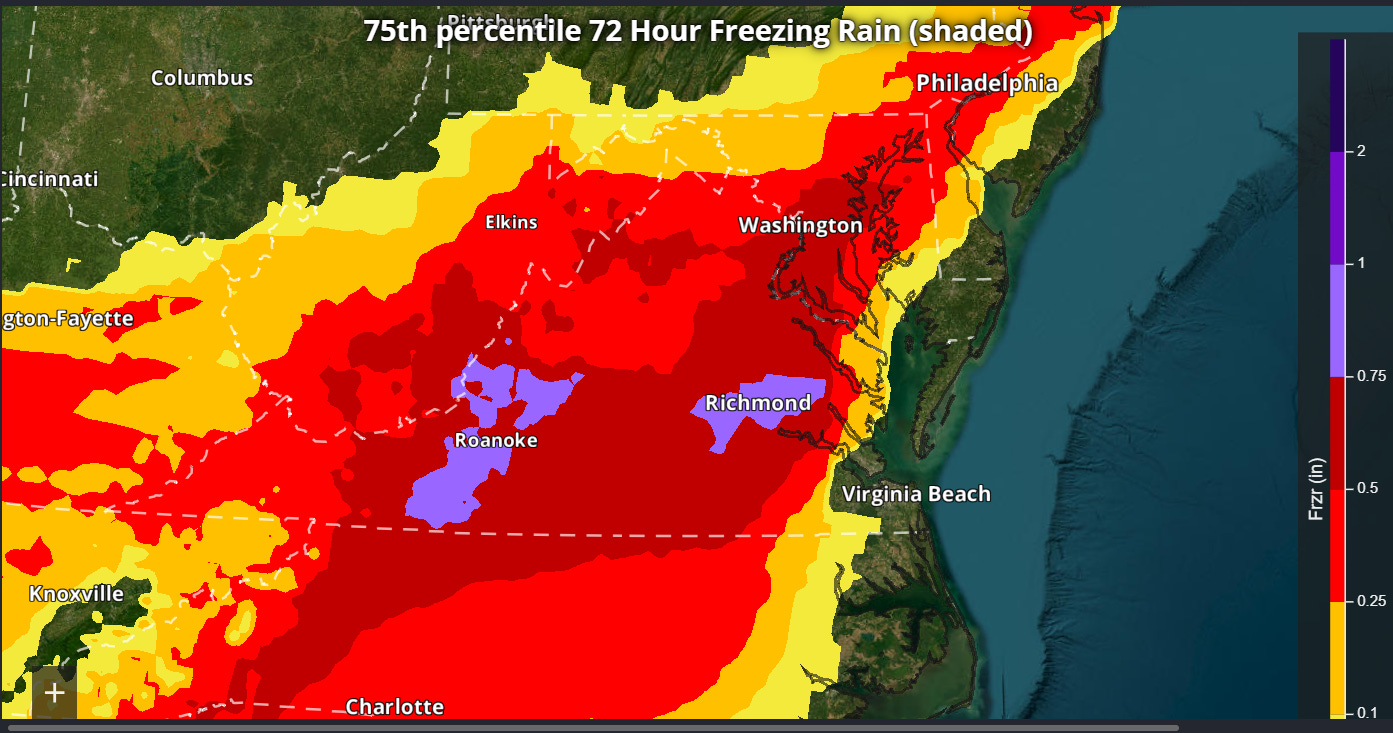 A reasonable worst case scenario (75th percentile probability) ice accumulation from the NWS National Blend of Models for the Mid-Atlantic suggests .5 to 1” ice accumulations are possible for much of Virginia, which could cause major damage to power infrastructure. Given the extremely cold temperatures expected after this event, this again would be of serious concern.
