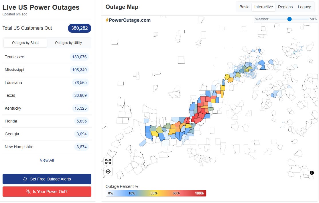 Speaking of impact weather, slow recovery continues from this past weekend’s winter storm. Power restoration continues, but nearly 400,000 customers still remain without power this morning, about 3 days after the end of the ice storm in the region. USAToday reports that more than 60 people have died from a variety of winter weather related incidents from this storm, including more than two dozen from hypothermia and exposure. Several children have died in tragic incidents involving them falling through ice on ponds — a particular issue when unusually cold air causes ponds and lakes to freeze in the South, where children (and adults) are not aware of how easily the ice can break and the rapidity with which someone can succumb to hypothermia in the freezing water.