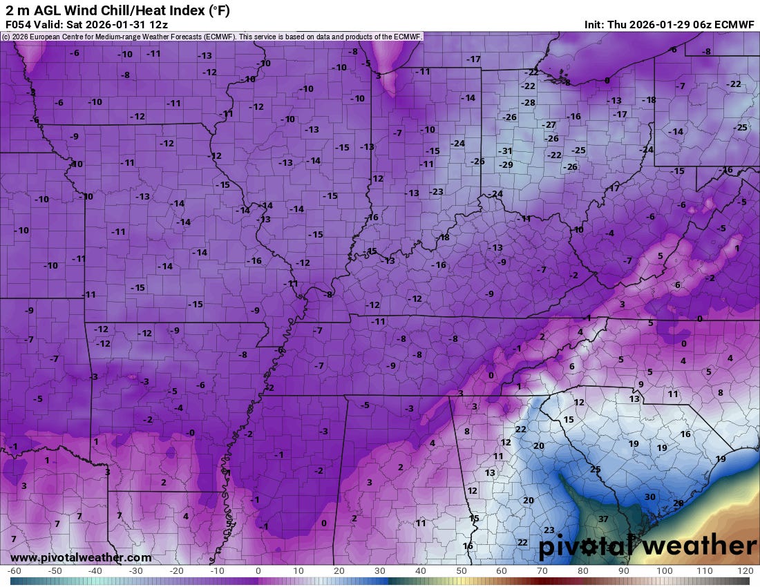 As the intense low pressure system develops along the Carolina coast this weekend, strong northerly winds will also develop, which will push wind chill readings below zero across a large swath of the Midwest and East, including into areas where such extreme cold is rare like Mississippi. Obviously, those without power will be at serious risk from hypothermia and exposure as this bitterly cold weather moves in.