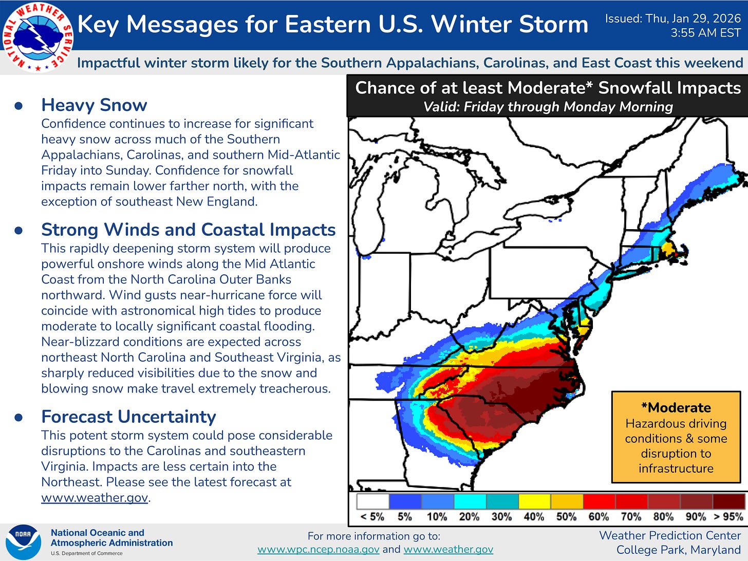 There are still uncertainties about the evolution of this storm system — but it is becoming increasingly certain that significant impacts from heavy snow and high winds will impact much of the Carolinas into parts of eastern Georgia and southern Virginia Friday into the weekend, with potential impacts northeast along the coast. The track of the low pressure system is less clear farther north, but the most likely impacts look to be in southeast New England and especially Cape Cod and the Islands
