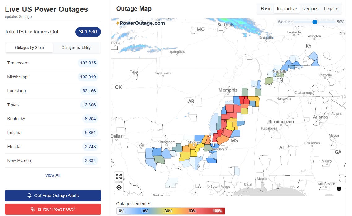 While significant progress has been made in power restoration, 300,000 customers still remain without power, with Mississippi particularly concerning as numerous counties in the Delta and northern Mississippi still have more than 50% of their population without power per Poweroutage.us. My friend Marshall Ramsey, a longtime author and political cartoonist in Mississippi, wrote a column in Mississippi Today I urge you to read talking about his experience living through the storm in Oxford, which appears to be have been the essential ground zero for the most serious impacts. The University of Mississippi in Oxford announced yesterday that it would be closed through the end of next week due to the serious damage to the city and its infrastructure. Some highlights from a post that Marshall made on Facebook last night about the impacts:
