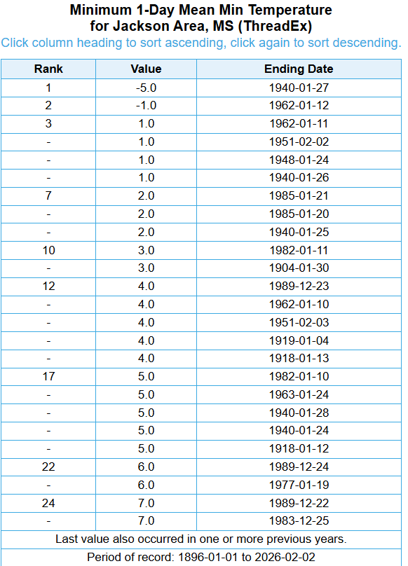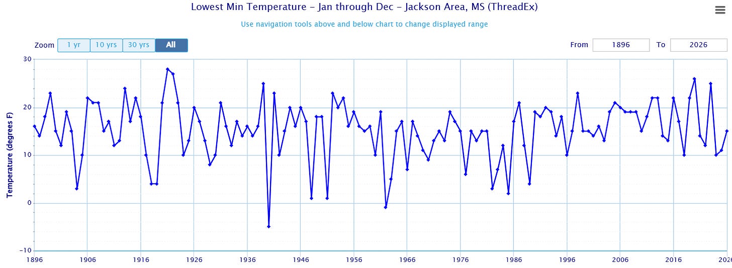 In fact, Jackson has not seen a low below 10F since 1989 (it has hit 10F exactly a few times) — in this particularly cold stretch over the last few weeks, the coldest temperature observed there was 15F, 20 degrees warmer than the all-time record low of -5F set in 1940.