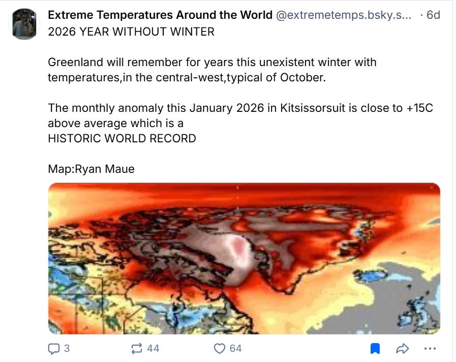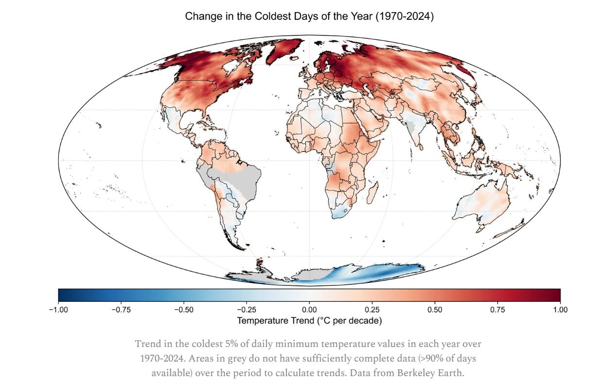 Noted climate scientist Zeke Hausfather reposted yesterday his excellent article explaining the climate science that clearly demonstrates that nearly all of the globe is seeing extreme cold become a less frequent phenomena, as shown in this graphic from his article above.