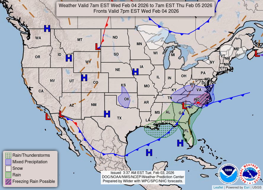 That storm system will continue to move toward the coast by Wednesday, with some light freezing rain and mixed wintry precipitation possible over the Mid-Atlantic with rain and storms farther south. Most of the rest of the country will be dry.