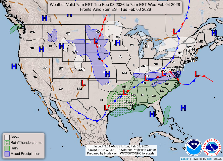 Taking a quick look at US weather, today will see another storm system moving across the eastern United States, but rain and thunderstorms will be the predominant precipitation type as warmer Gulf air surges north. Some wintry precipitation will occur in the Mid-Atlantic and Ohio Valley on the northern fringe of the precipitation shield. Warmer than normal and mainly dry weather will continue over the West.