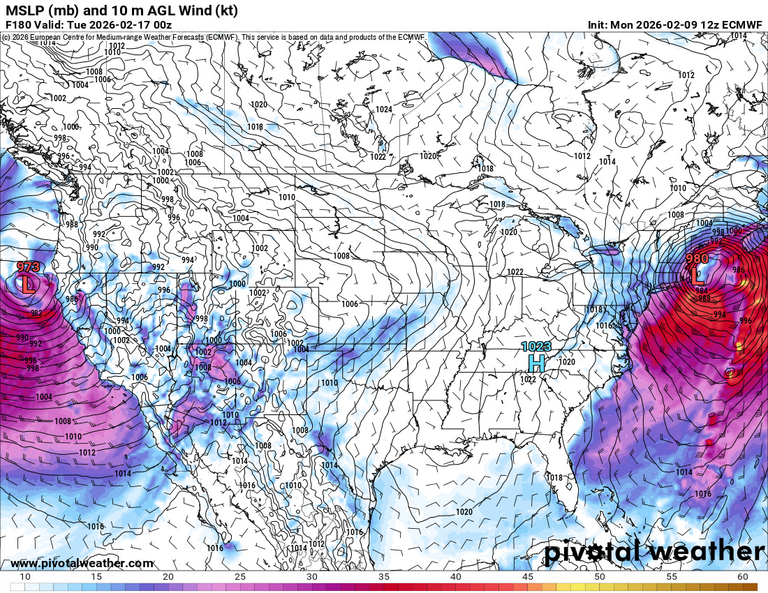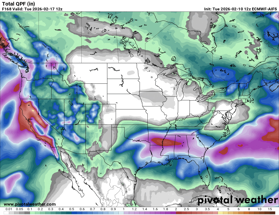 Coming back to North America, this 7-day animation of the 500 mb forecast from this morning’s hot off the press European AI model shows the long advertised evolution of the weather pattern expected across the US this week. A series of storm systems will gradually break down the large area of high pressure aloft in the West, climaxing in an intense system approaching the West Coast Sunday into Monday. Meanwhile, a ridge of high pressure aloft will gradually build east from the central United States toward the East Coast, resulting in a trend toward milder weather east of the Rockies.