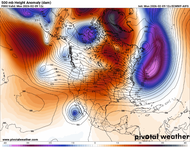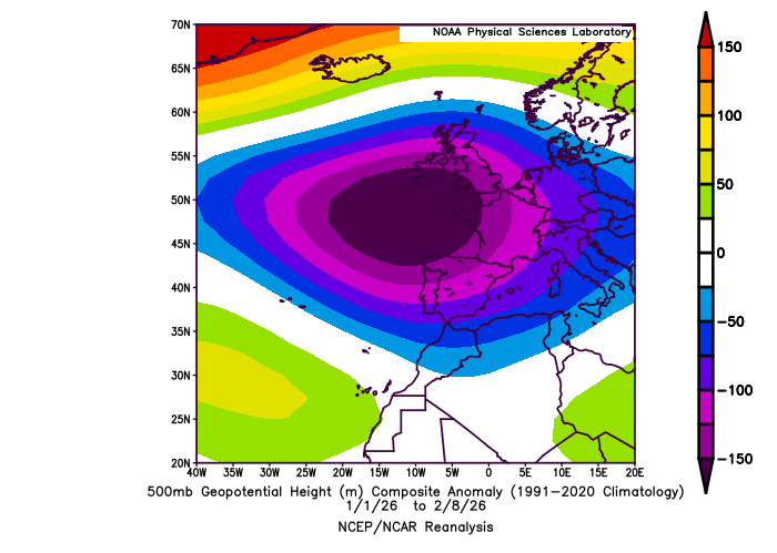 The 500 millibar (mb, ~18,000 ft AGL) anomaly since the start of 2026 is literally “off the charts” with a nearly 200m anomaly centered just southwest of Britain.