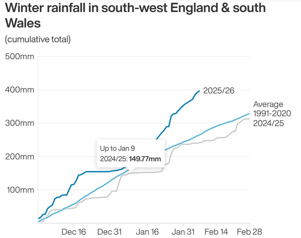 In my post yesterday, while talking about the persistent upper level weather pattern in the Northern Hemisphere I noted that along with the trough along the East Coast there was also an anomalous trough centered near Europe. One of my readers on BlueSky noted that the UK is dealing with record rainfall as part of this pattern, and I decided to start off this morning with a bit of a dive into the impacts of another region dealing with this seemingly stuck Northern Hemispheric weather pattern, i.e., western Europe.