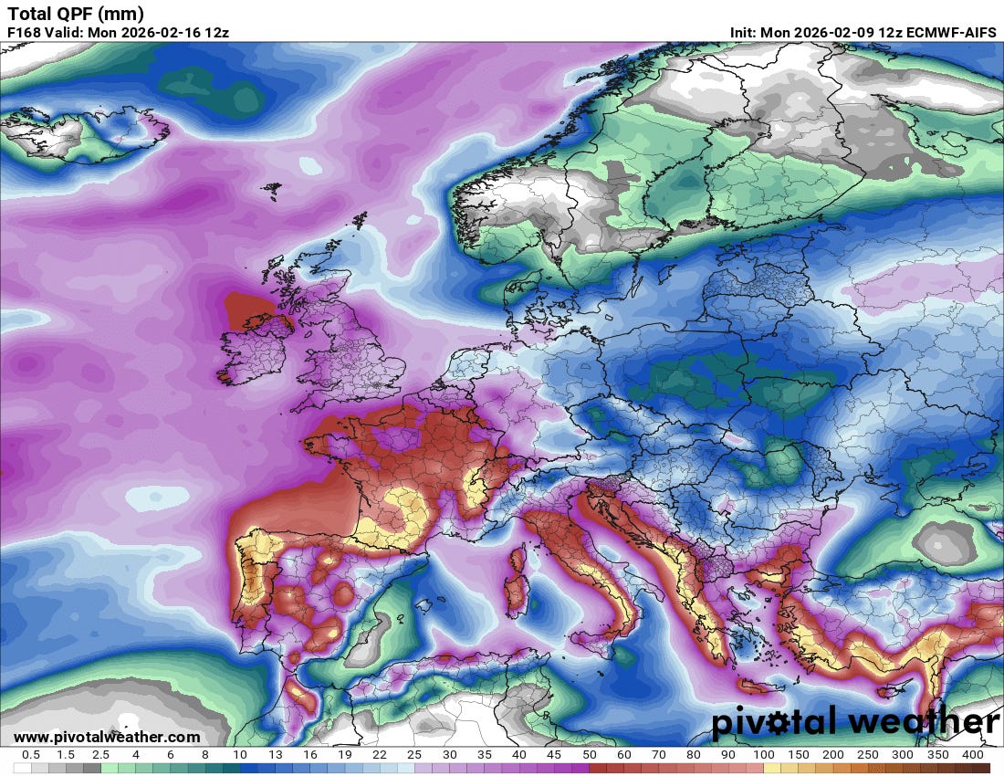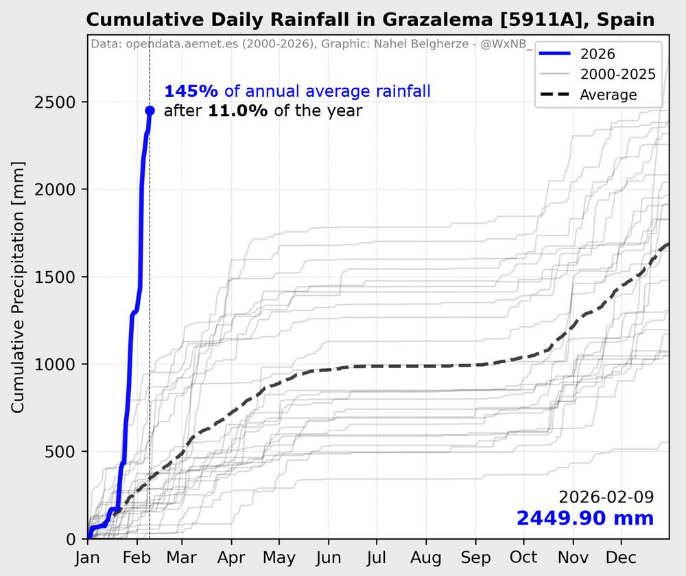 Nahel Belgherze posted this incredible graphic on BlueSky last night showing that Grazalema, Spain has picked up nearly 2500 mm (2449.9 mm = 96.5”) of rain since the start of 2026. As he notes, this is 145% of its normal annual rainfall total — and it has picked that up in the first 5+ weeks of the month. Not surprisingly, this rainfall has produced serious flooding in Spain and Portugal, with more than 11,000 people forced from their homes in Andalusia and serious damage and impacts to transportation and agriculture across the region.
